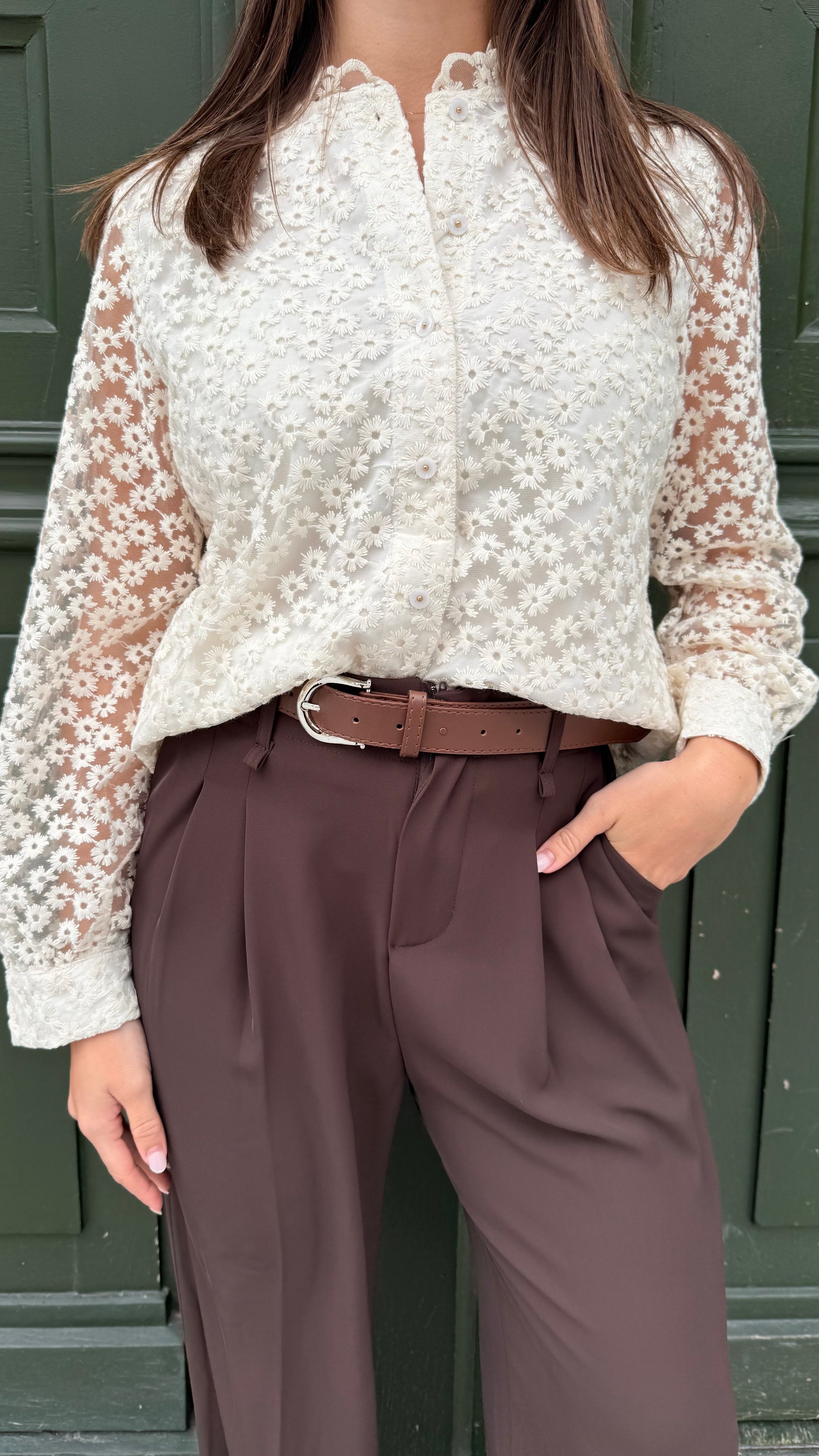 ▫ blouse couleur crème à motif fleur, doublé sur le devant de la blouse et tout en transparence sur les manches et au dos.