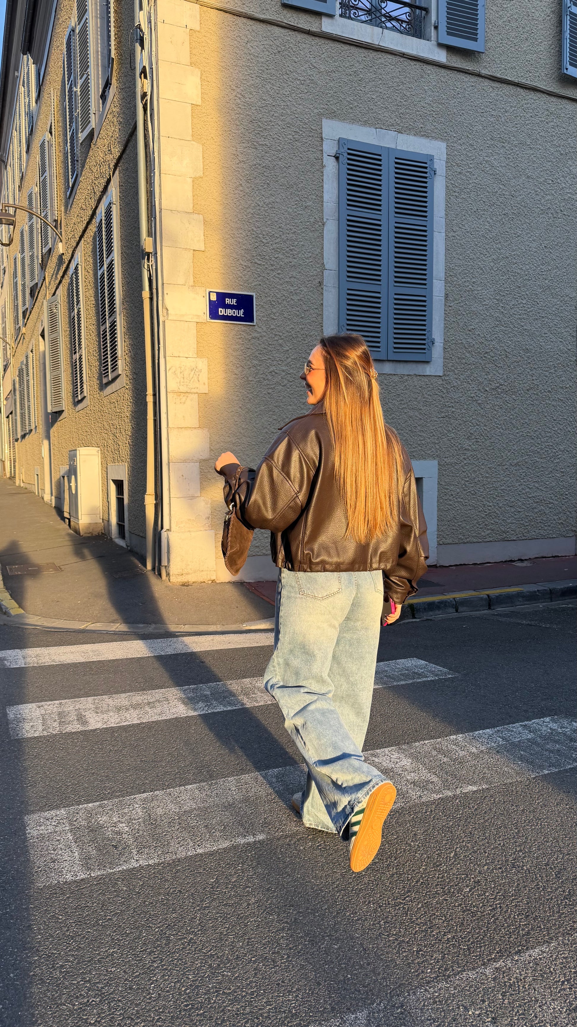 ▫ veste en simili cuir courte, effet bombes manches boufantes oversize