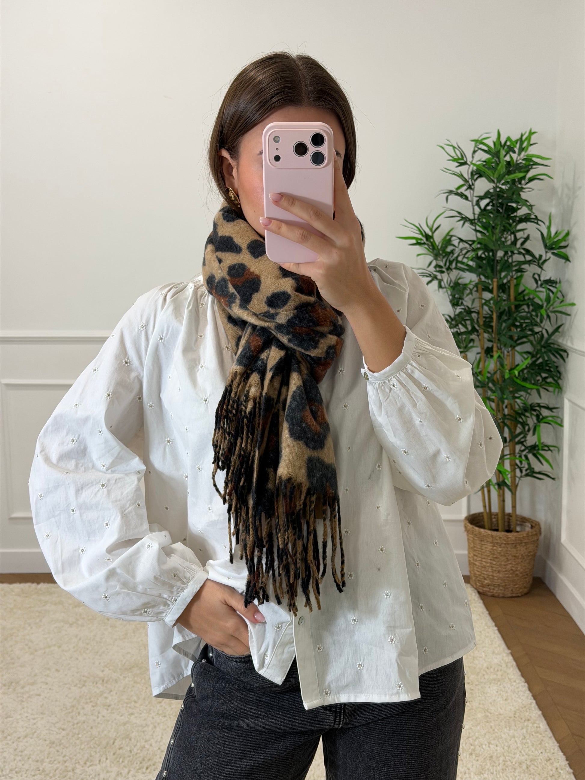 ▫ écharpe léopard en viscose et laine, idéal pour réchauffer vos tenues d'automne.
