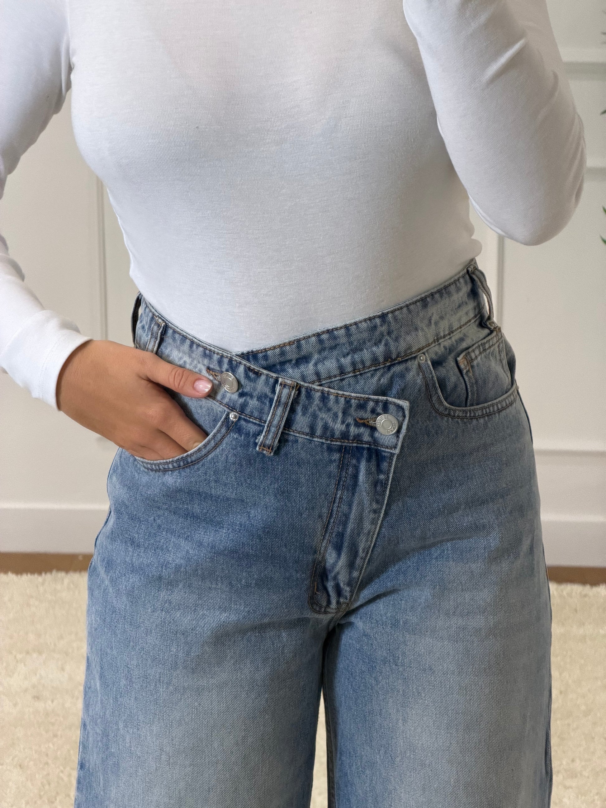 ▫ jean bleu clair asymétrique. coupe large.