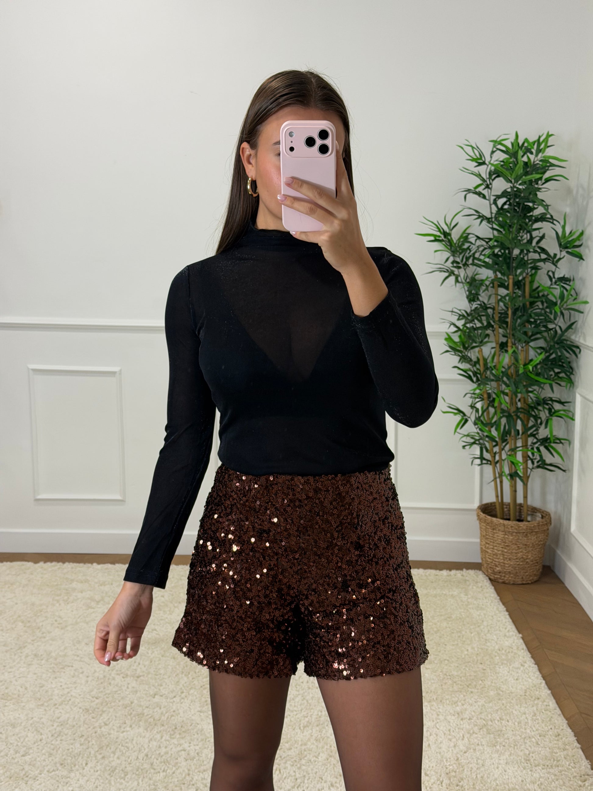 ▫ short à sequins marron, très tendance avec une chemise blanche. La modèle porte une taille S, prendre sa taille habituelle.