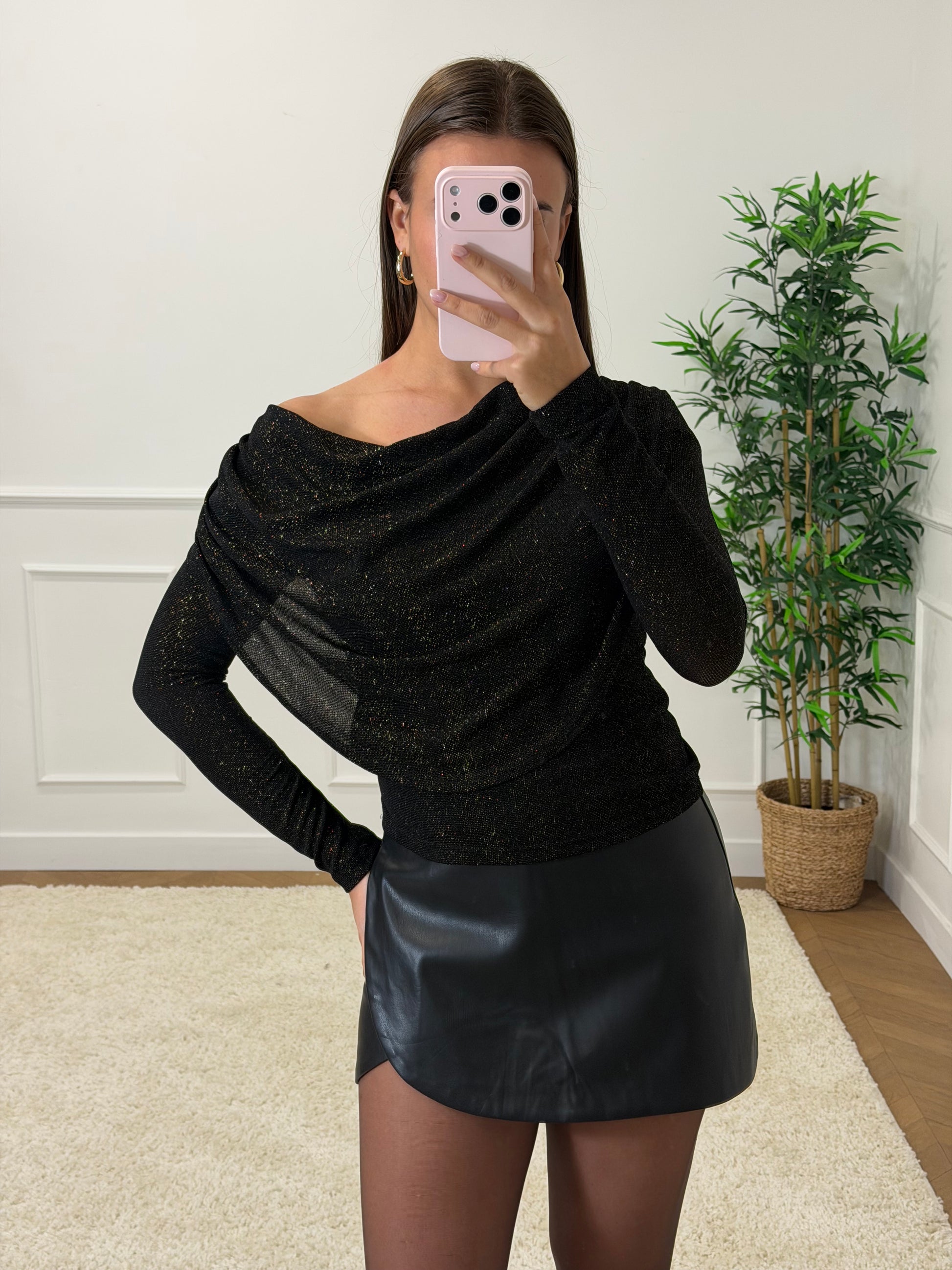 ▫ top noir brillant à manche longue, à col tombant